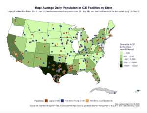 - Geographic Distribution of Facilities: The geography of ICE facilities that detained people during FY2025, focusing on newly reported facilities under the Trump administration to date and in the most recent reporting period.